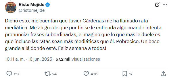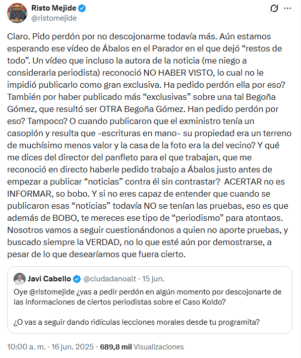 Retrocedamos al fatídico 16 de junio de 2025, cuando el mundo era un poquito más inocente (o al menos, Ábalos aún podía presumir de chalé sin barrotes). Todo empezó con un inocente (ja) piquecito de Javi Cabello (@ciudadanoalt), un tipo que parece haber nacido para repartir estopa digital como si fueran croquetas en una boda. «Oye @ristomejide, ¿vas a pedir perdón por descojonarte de las informaciones sobre el Caso Koldo? ¿O vas a seguir dando ridículas lecciones morales desde tu programita?», le soltó Cabello, citando las carcajadas de Risto ante las «exclusivas» de Ketty Garat en The Objective. ¿El delito de Risto? Reírse a mandíbula batiente de las acusaciones de orgías en el Parador de Sigüenza, mordidas millonarias en contratos de mascarillas y un exministro convertido en rey del mambo corrupto.