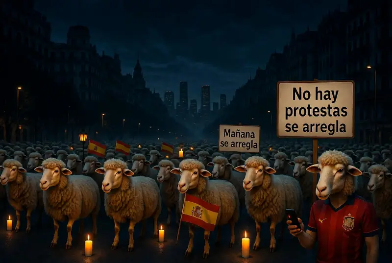 Y aquí viene lo realmente épico: los españoles, en vez de salir a la calle con antorchas, cacerolas y un par de ovarios colectivos, nos limitamos a encender la linterna del móvil, poner cara de “bueno, total, ya se arreglará” y seguir con nuestras vidas como si nada. Porque claro, protestar es de radicales. Y nosotros somos muy civilizados. Civilizados como borregos en una pradera con WiFi gratis.