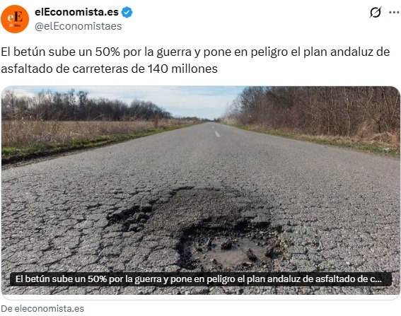 Según la noticia de El Economista, el precio del betún (sí, esa cosa pegajosa y negra que se echa encima de las carreteras para que no parezcan la superficie de la Luna) ha subido un 50% “por la guerra”. Y eso pone en jaque el plan andaluz de asfaltado de 140 millones de euros. Traducción: las carreteras andaluzas van a seguir pareciendo que han sido bombardeadas… pero no por misiles rusos, sino por la falta de presupuesto y la eterna mala gestión.